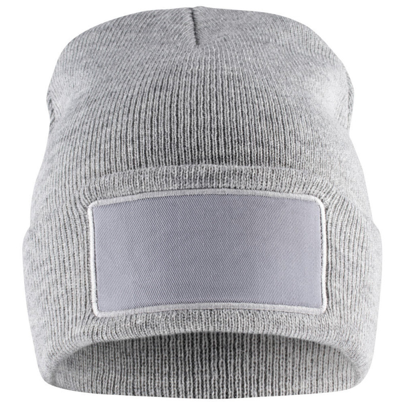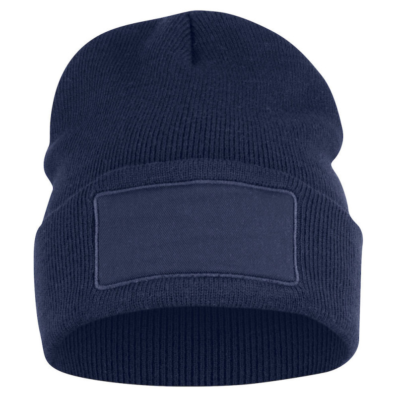 Strickmütze mit Umschlag. Extra Aufnäher vorne zum Bedrucken. Patch-Maße: 10 x 5 cm