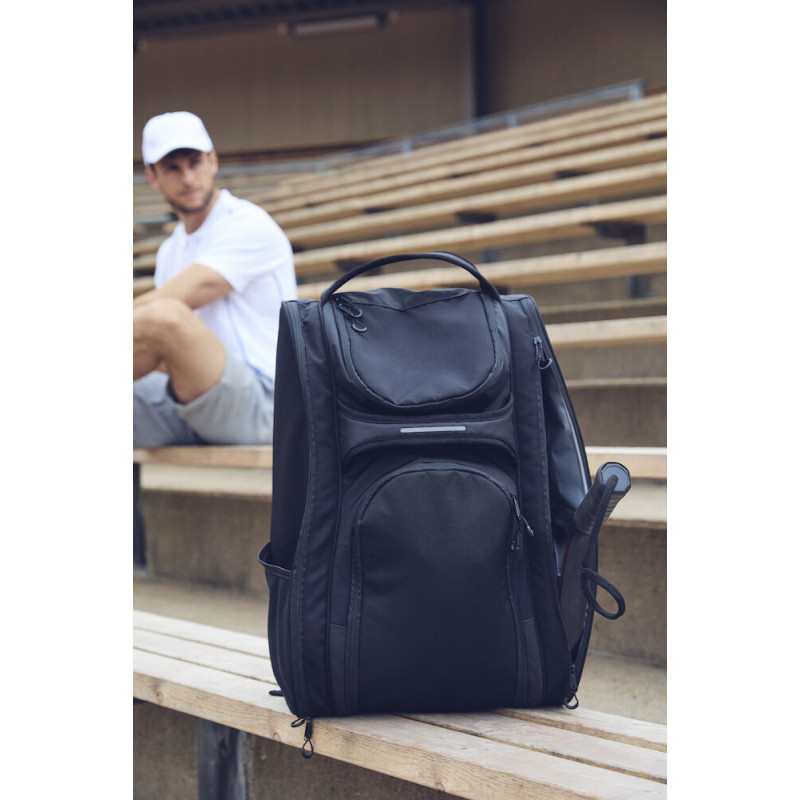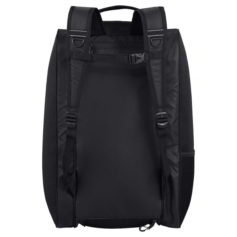 Skrytá bezpečnostní kapsa za ramenními popruhy a velká boční síťovaná kapsa.